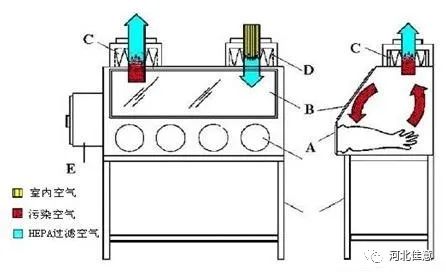Ⅲ级生物安全柜是专为高等级生物安全实验室而设计的,是完全封闭、不泄漏结构的通风柜。人员通过与柜体密闭连接的手套在安全柜内实施操作,俗称手套箱,试验品通过双门的传递箱进出安全柜以确保不受污染,适用于高风险的生物试验。下降气流经高效过滤器过滤后进入安全柜用以保护安全柜内实验物品;排出气流经两道高效过滤器过滤或通过一道高效过滤器过滤再经焚烧处理用于保护环境。