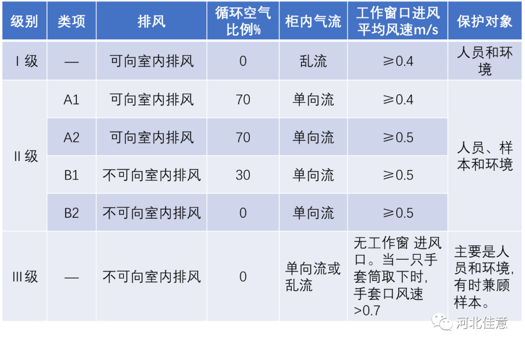 根据生物安全防护水平的差异,生物安全柜可分为Ⅰ级、Ⅱ级和Ⅲ级三种类型。