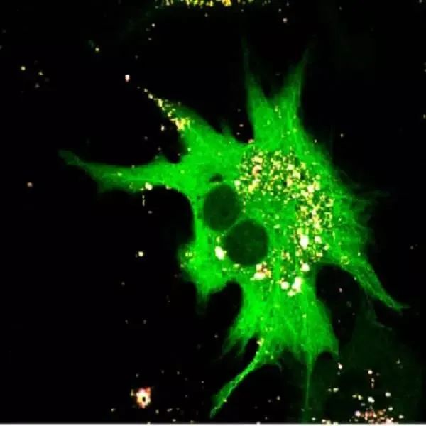 图片介绍:3T3细胞,GFP染色微管(绿色),Cy5标记纳米粒子(白色),透过共聚焦显微镜,我们可以看到正在分裂的细胞的两个细胞核构成了骷髅的两只眼睛,纳米粒子形成头骨。共聚焦显微镜是生命科学研究中非常重要的表征手段,通过荧光标记,我们可以实时、原位地观察各标记物的动态过程。通过研究纳米粒子在细胞中的运动过程,可以为纳米粒子作为药物载体等生物应用提供实验依据。
