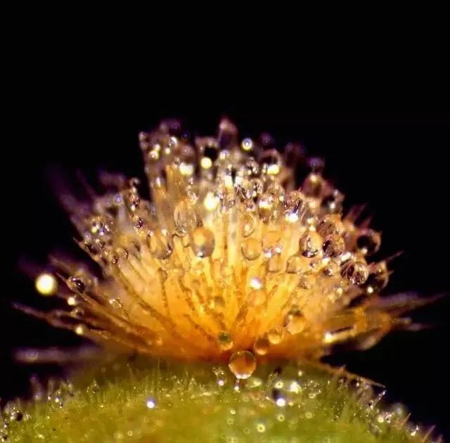 图片介绍:图片描述的是在显微镜下观察雾气中小液滴在仙人掌的簇状刺与绒毛的凝结行为。仙人掌在沙漠中依靠其针簇和绒毛进行雾气收集,获取所需水分。研究这种雾气收集的原理,可以帮助我们设计雾气中水分的收集装置,在清洁水日益减少的今天,这些研究显得日益重要。雾气中的小液滴凝结在仙人掌的针刺上,在显微镜下看,金灿灿带着珍珠光茫的小水滴点缀着半球形的刺簇。