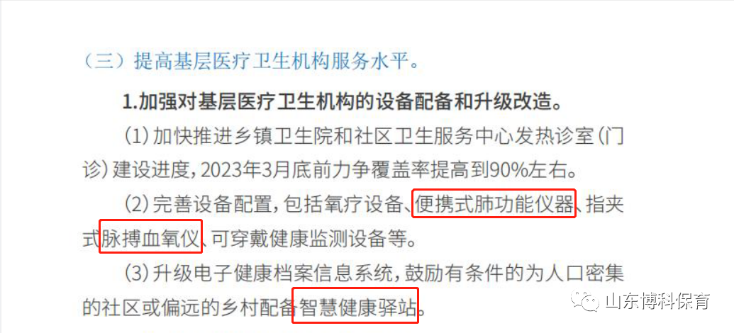 国家卫健委出台《新冠重点人群健康服务工作方案》,方案提及基层医疗卫生机构要完善设备配置,包括氧疗设备、便携式肺功能仪器、指夹式脉搏血氧仪、可穿戴健康监测设备等。