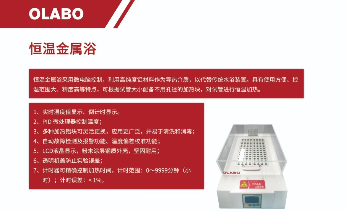 恒温金属浴又称干式恒温器,恒温金属浴采用微电脑控制,利用高纯度铝材料做为导热介质,以代替传统的水浴装置,具有外观精美、使用方便、精度高、体积小等特点。