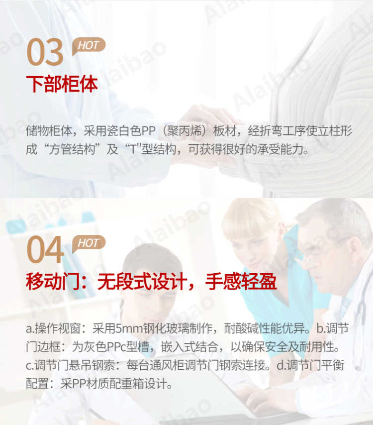 采用瓷白色PP(聚丙烯)板材,厚度8MM 折弯加厚防溢设计。可选配实芯理化板台面、环氧树脂台面或陶瓷台面等。